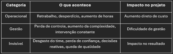 Em gestão de projetos, esse tipo de decisão é especialmente perigoso porque o erro no início não fica no início. Pelo contrário, ele se propaga ao longo de toda a execução e multiplica o custo de correção.